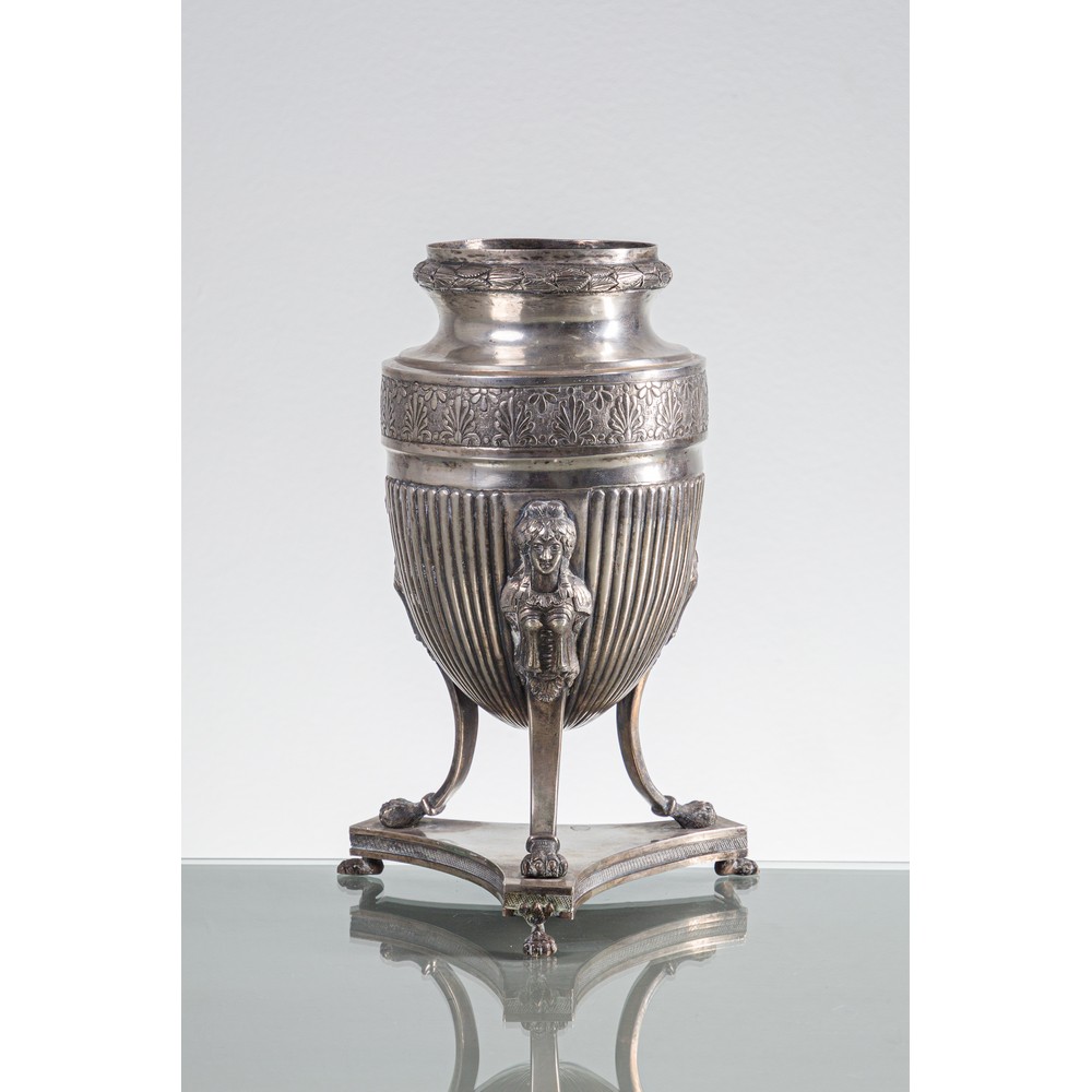 Vaso Retour d'Egypte in argento inciso e sbalzato con figure di cariatidi e zampe ferine.