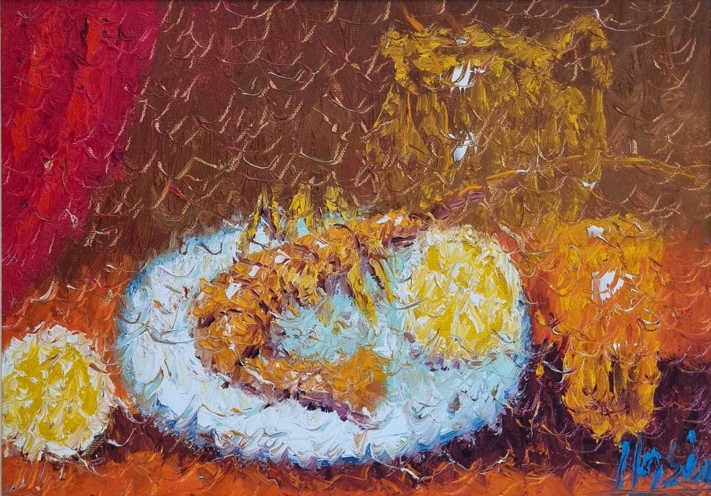 MASI ROBERTO Firenze 1940-2011 "Natura con aragosta" olio su tela cm 35x25. Firmato sul fronte in basso a destra. Al retro firma, etichetta descrittiva e timbro per provenienza Galleria Castello.