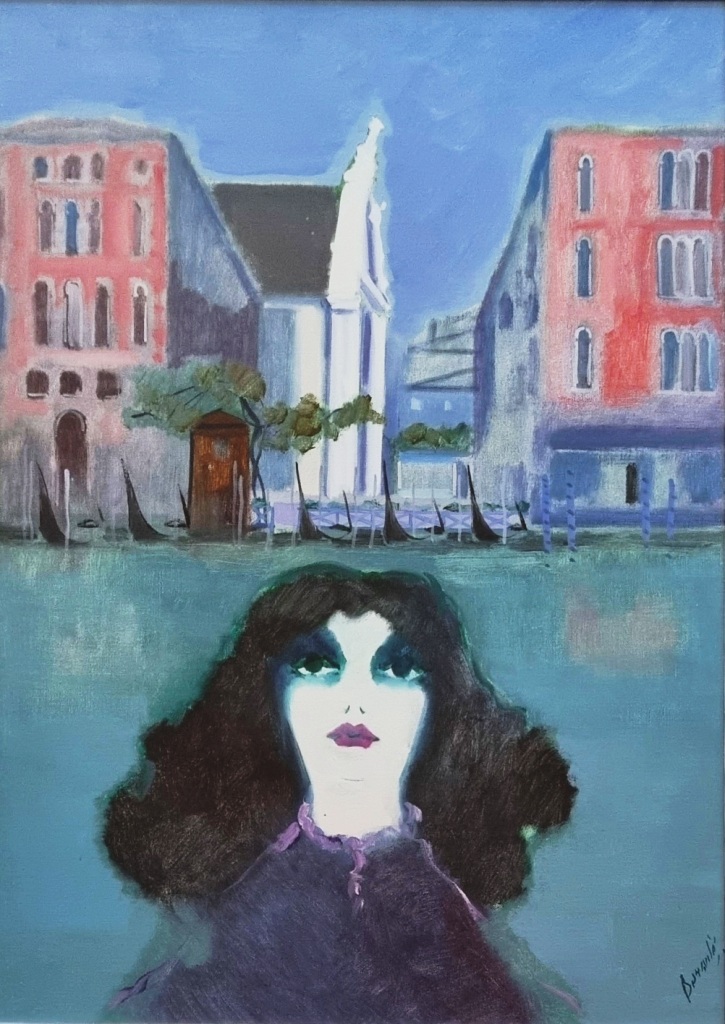 BORSATO RENATO Venezia 1927-2013 "Incontro" olio su tela cm 50x70. Firmato sul fronte in basso a destra. Sul retro titolo, firma e timbro dello studio dell'artista.