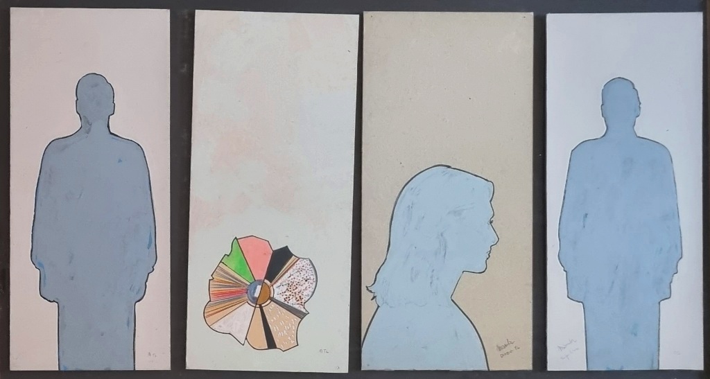 MAMBOR RENATO Roma 1936-2014 "Diario a tempo libero" 4 pannelli in cartone assemblati in un'unica opera cm 80x60 del 2001. Sul fronte firmato ed intitolato sui due pannelli a destra. Autentica su foto a cura dell'artista.