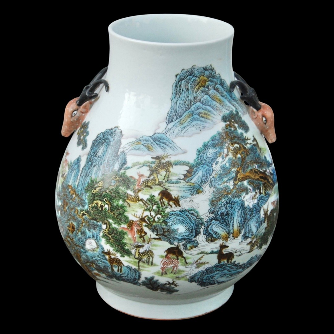 Cina vaso in porcellana a smalti policromi con decoro cento cervi e anse a guisa di testa di cervo