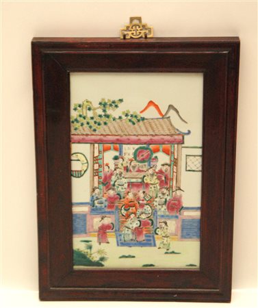 Cina placca in porcellana raff.scena di vita quotidiana con cornice in legno