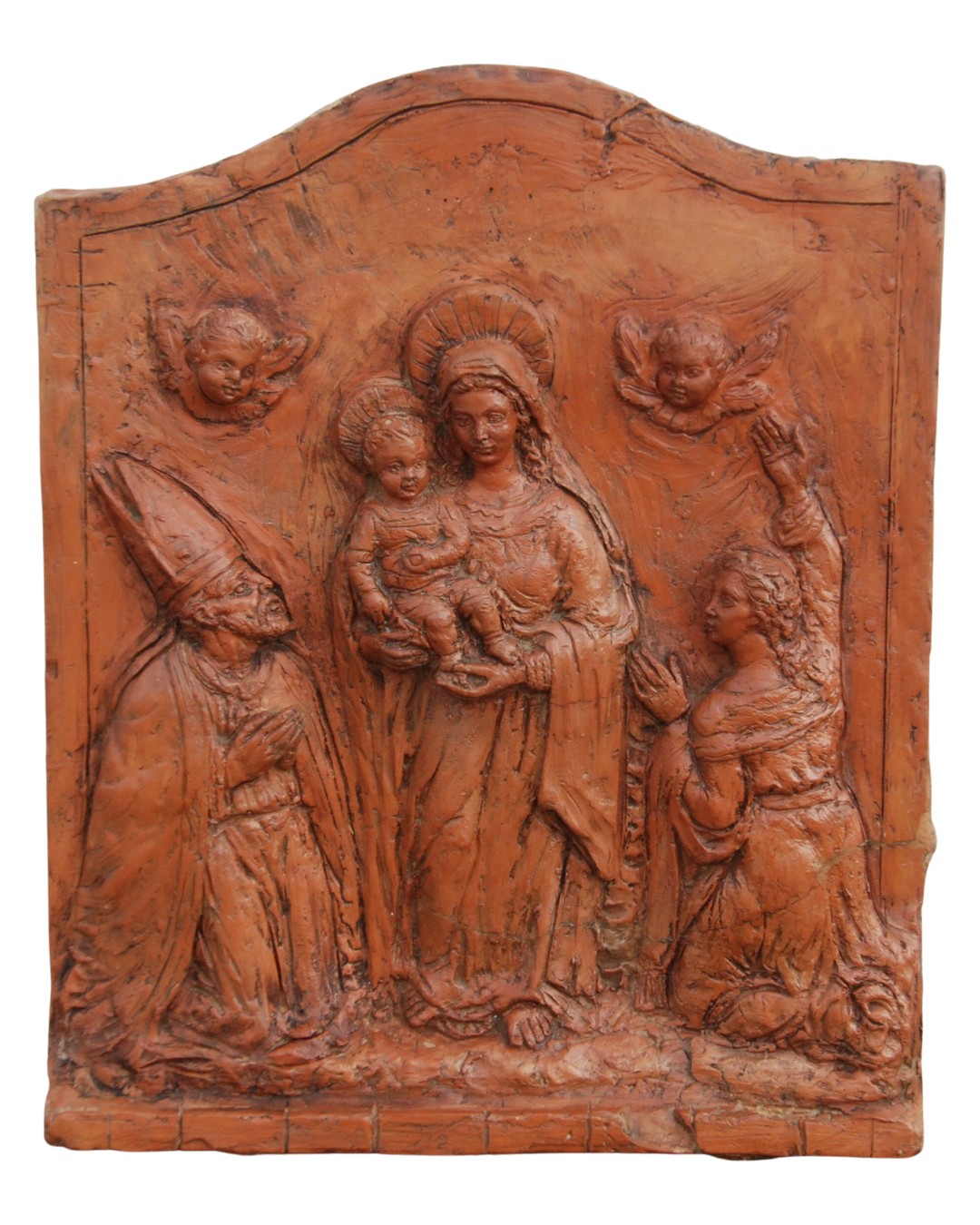 placca in terracotta raff.Madonna con bambino e santi sec.XVI