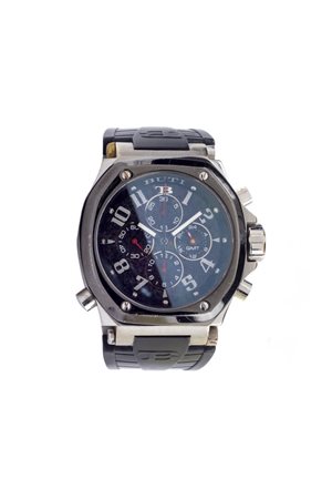 Cassa in acciaio, di forma tonneau, con lunetta nera e tasto di attivazione della doppia cronografia