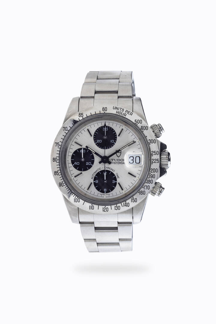 Cassa in acciaio con fondello, corona e tasti della cronografia a vite e marchiati Rolex. Lunetta tachimetrica in acciaio. Quadrante argento di grande qualità con indici geometrici applicati e contatori a contrasto neri che indicano rispettivamente ad ore 9 i secondi continui, al 12 i 30 minuti ed al 6 le 12 ore. Presente datario al 3. Bracciale in acciaio “Oyster” integrato con chiusura clasp.
