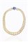 composta da due fili di perle giapponesi a scalare dal diam. di mm 10,7 a 7. Chiusura in oro bianco con al centro grande zaffiro Ceylon di ct 7,0 ca e due diamanti taglio brillante di vecchio taglio per totali ct 2,50 ca e diamanti taglio 8/8, baguette e brillante per totali ct 1,50. Totali 4 ct