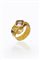 in oro giallo, sommità a volute, al centro quarzo citrino taglio carré ed ai lati uno zaffiro ed uno smeraldo taglio rotondo