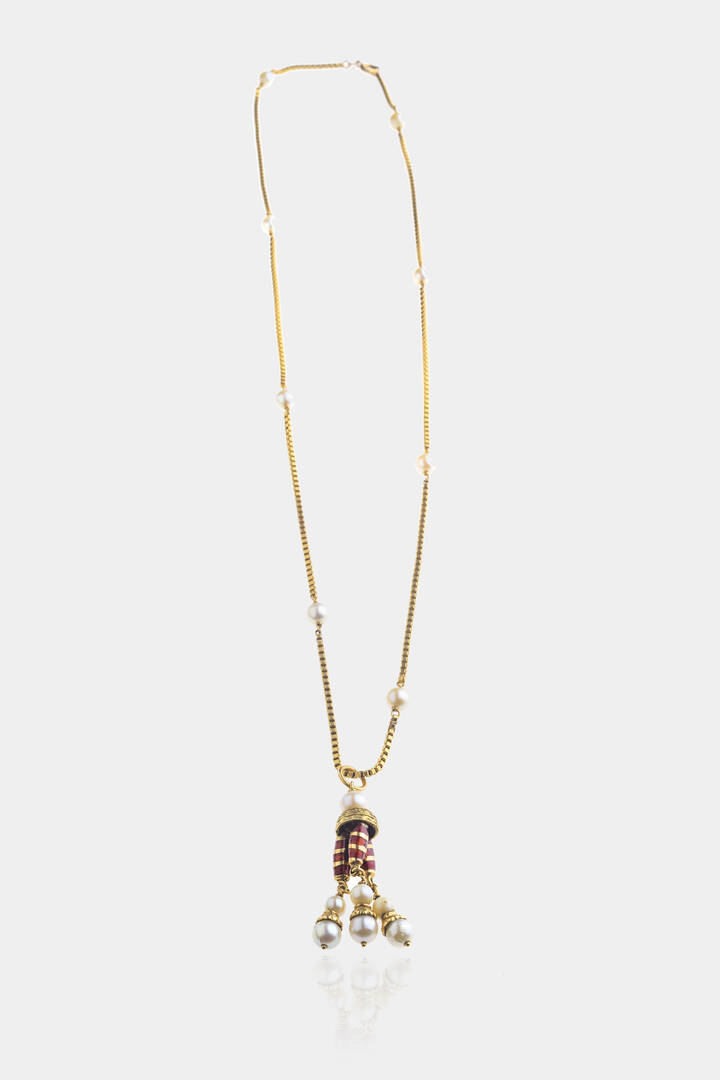 in oro giallo con perle giapponesi del diam di mm 5,0 ca: al centro ciondolo in smalti rossi e perle giapponesi del diam di mm 4,5 e 5 ca