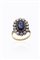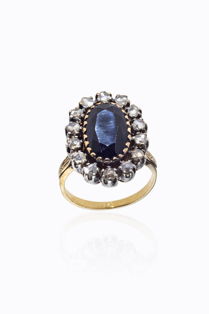 in oro giallo a bassa caratura ed argento, sommità a margherita con al centro zaffiro taglio ovale di ct 4,50 ca, contornato da rosette di diamanti per totali ct 0,70 ca