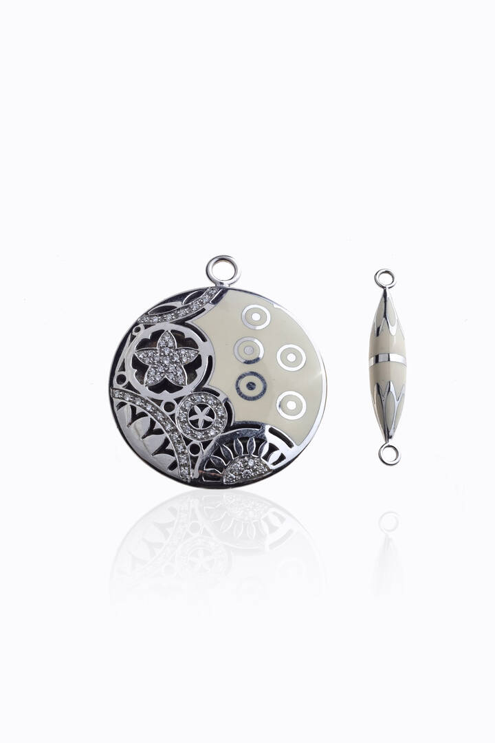 Coppia di due ciondoli in oro bianco, uno firmato "Nouvelle Bague", con smalto bianco e diamanti taglio brillante per totali ct 0,40 ca
