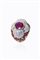 in oro giallo e bianco, sommità bombata al centro rubino taglio ovale di ct 3,0 ca, contornato da quattro petali in pavé di diamanti taglio brillante per totali ct 2,20 ca, probabile colore G-H, purezza IF-VVS; rubini taglio rotondo a decoro per totali ct 2,80 ca