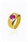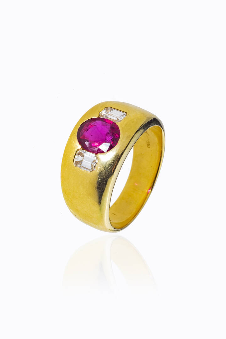 in oro giallo, a fascia, con al centro rubino taglio ovale di ct 1,80 ca ed ai lati due diamanti taglio smeraldo per totali ct 0,50 ca