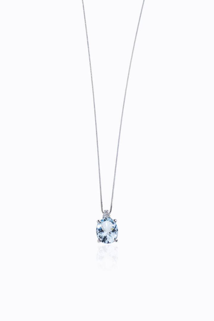 in oro bianco con acquamarina taglio ovale di ct 2,89 ca, sormontata da diamanti taglio brillante per totali ct 0,05 ca, probabile colore G-H, purezza IF-VVS