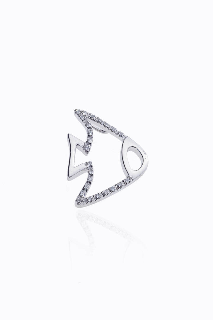 in oro bianco a forma di pesce con diamanti taglio brillante per totali ct 0,13 ca, probabile colore G-H, purezza IF-VVS