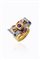 in oro giallo e bianco, sommità a voluta con al centro rubino taglio ovale di ct 0,70 ca; due file di rubini taglio carré per totali ct 0,50 ca e diamanti taglio brillante per totali ct 0,25 ca