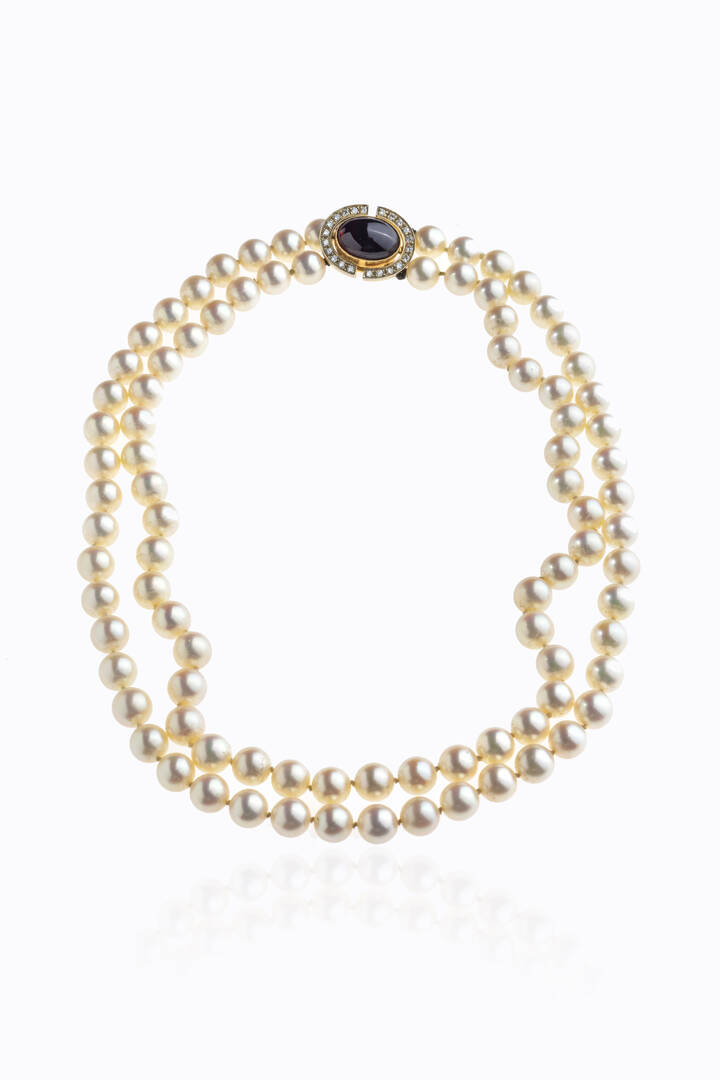 composto da due fili di perle giapponesi del diam. di mm 7,5. Chiusura in oro giallo con granato cabochon e contorno di diamanti taglio brillante per totali ct 0,40 ca