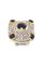 in oro bianco e giallo, sommità di forma quadrata con lati concavi, al centro zaffiro taglio ovale e ai quattro lati zaffiri taglio ovale per totali ct 5,50 ca; a decoro pavé di diamanti taglio brillante per totali ct 2,30 ca (uno zircone)