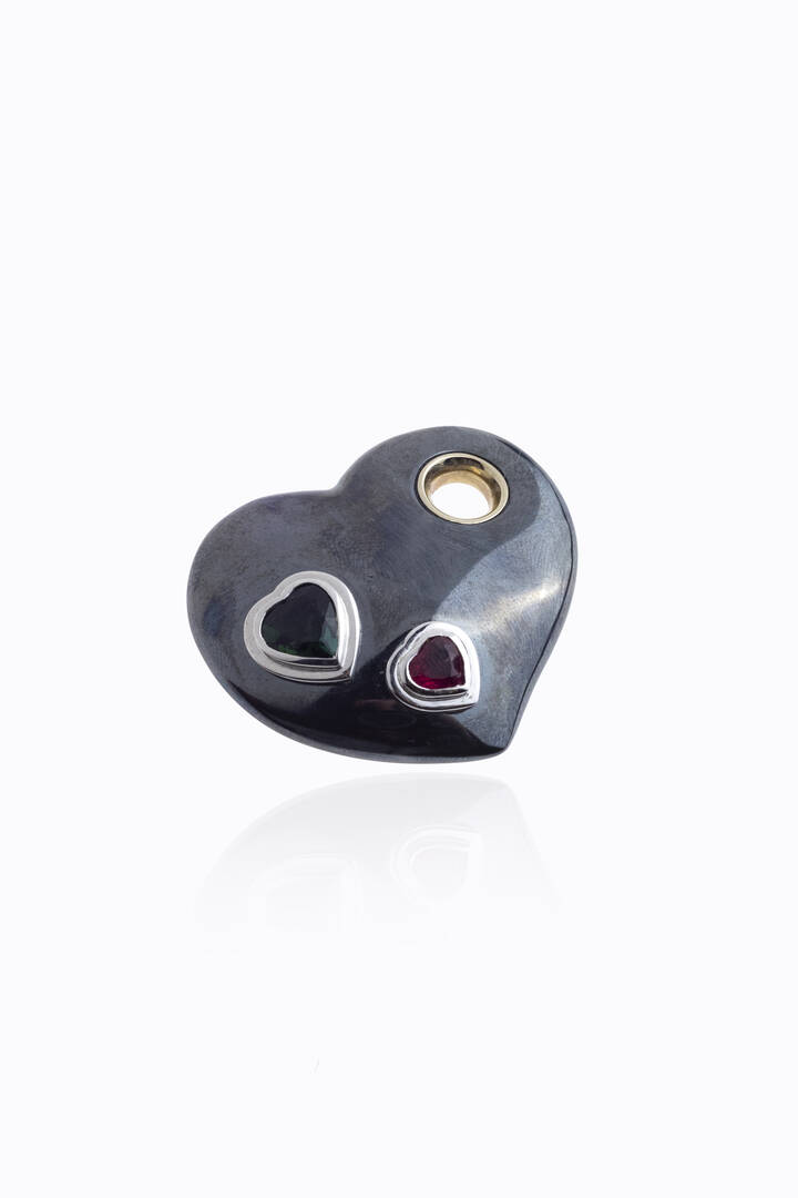 in ematite a forma di cuore con tormalina verde e rosa taglio a cuore ed anello in oro bianco