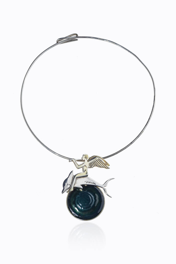 Girocollo in argento 925/1000, firmato "Marco Silombria", con angelo su delfino e sfera in smalto verde (difetti)