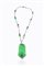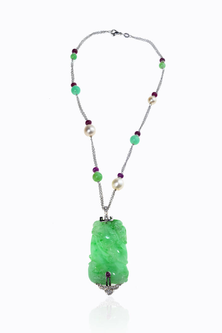 in oro bianco con sfere di giadeite, dischi di rubini, perle di acqua dolce; terminante con ciondolo in giadeite inciso e trattenuto da diamanti taglio brillante per totali ct 0,10 ca