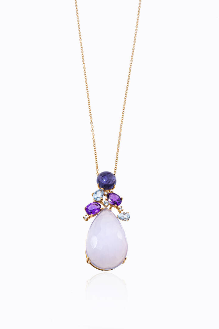 in oro rosa, con goccia briolette di acquamarina milk, sormontata da due acquamarine taglio a goccia, diamanti taglio brillante per totali ct 0,04 ca, probabile colore G-H, purezza IF-VVS, ametiste taglio ovale e cabochon