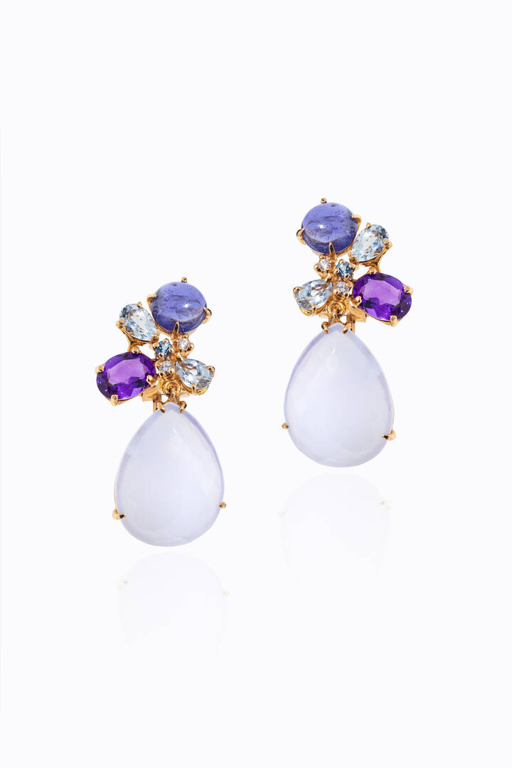 in oro rosa, con gocce briolette pendenti di peridoto, sormontate da acquamarine taglio a goccia, ametiste taglio ovale, ioliti cabochon e diamanti taglio brillante per totali ct 0,09 ca, probabile colore G-H, purezza IF-VVS