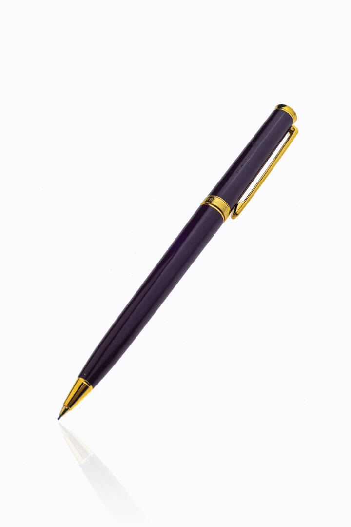 Mina "Montblanc", modello "Meisterstück". Corpo e cappuccio in resina viola, con l’emblema "Montblanc" bianco intarsiato nella parte superiore del cappuccio.