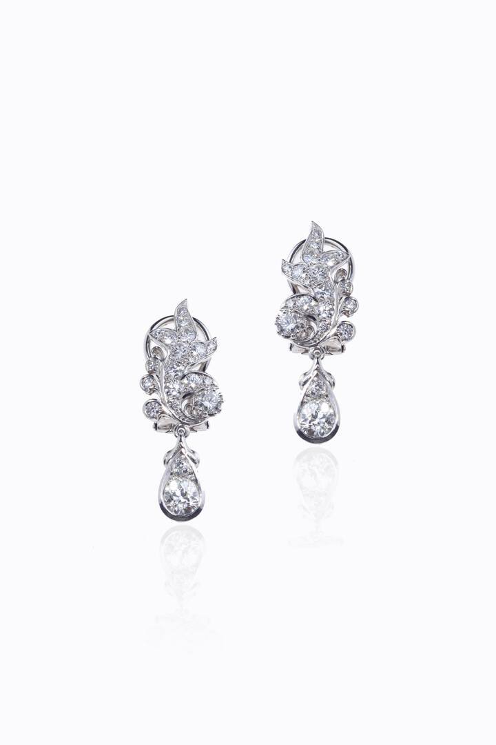 in oro bianco, XX secolo, a volute, con diamanti taglio brillante di vecchio taglio e 8/8 per totali ct 3,70 ca