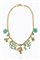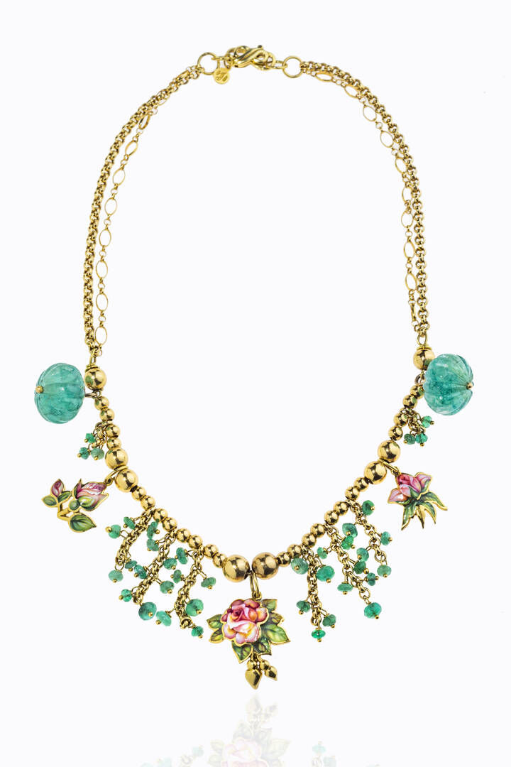 Girocollo in oro giallo, firmato "Gabriella Rivalta", con rose smaltate, dischi e sfere fesonate di smeraldi dal diam di mm 16,5 ca e 3 ca