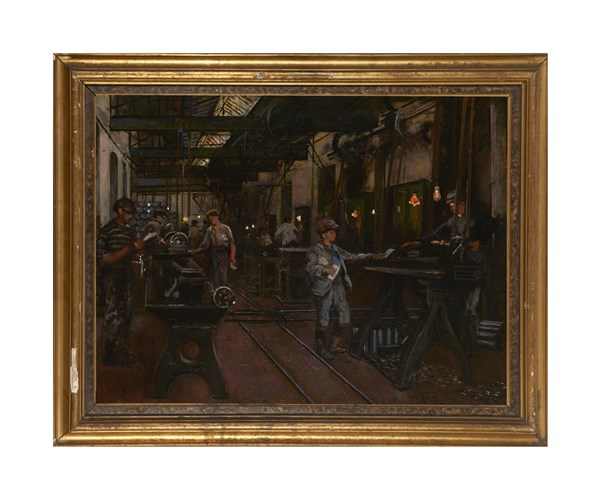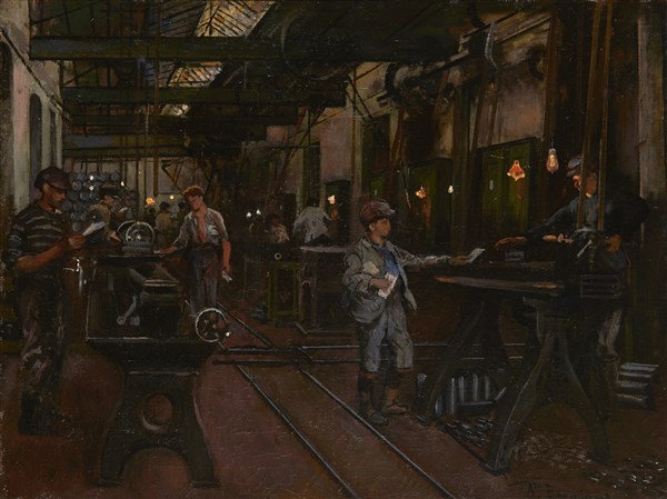 Augusto Bompiani "L'officina" olio su tela (cm 55x72) Firmato in basso a destra