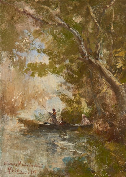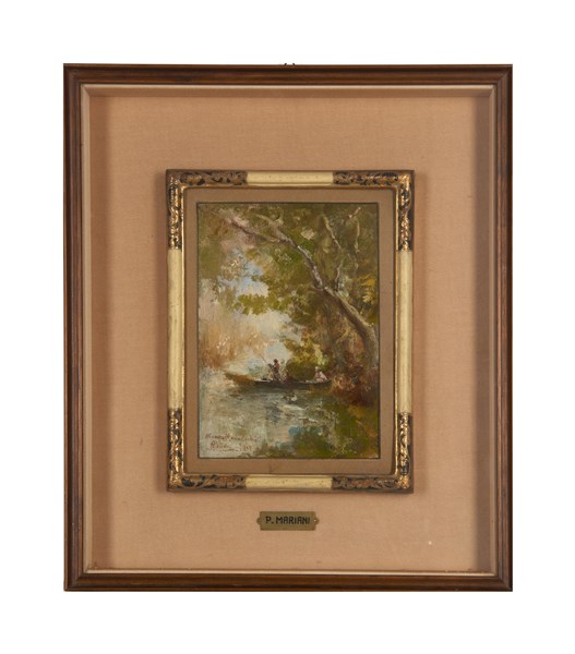 Pompeo Mariani "In barca" 1909olio su cartone (cm 22,5x15,5)Firmato, dedicato