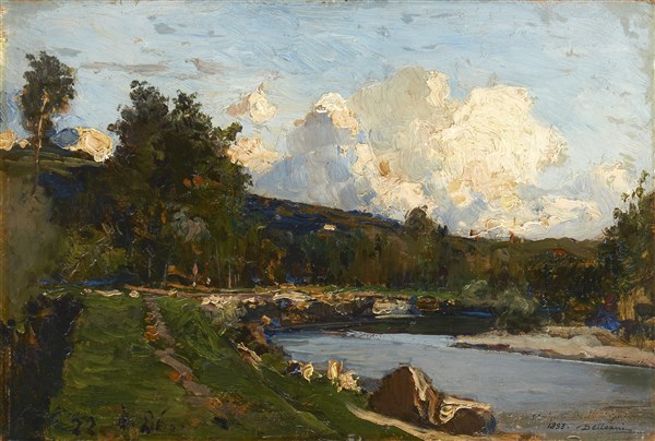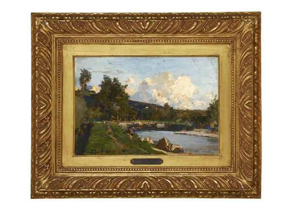 Lorenzo Delleani "Paesaggio con corso d'acqua" 22/ 8/ 86 olio su tavola (cm 25x3