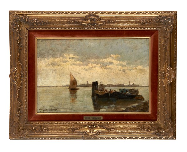 Pietro Fragiacomo "Barche in laguna" olio su tela (cm 32x47,5) Reca firma non c