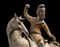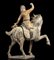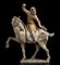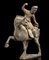Il cavallo è sostenuto su tre zampe da base all'incirca triangolare, il capo accentuatamente piegato, sulla groppa una figura di straniero con barba e copricapo, il braccio destro sollevato in alto, quello sinistro nei pressi di un cagnolino anch'esso posato sul dorso del cavallo, i dettagli dipinti applicati prevalentemente sulla figura umana.