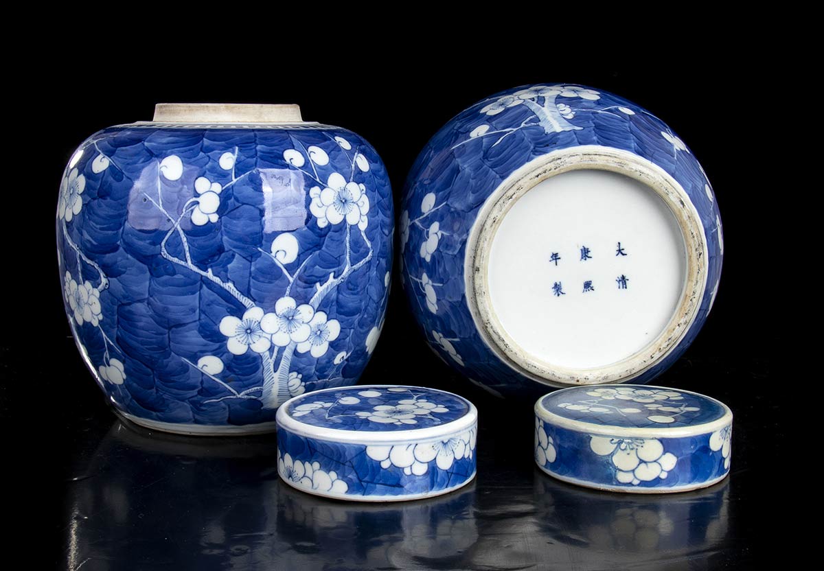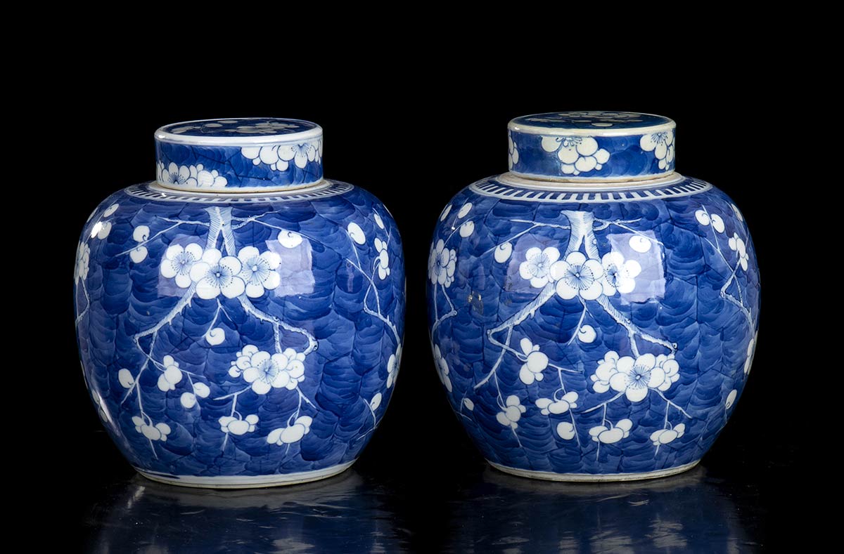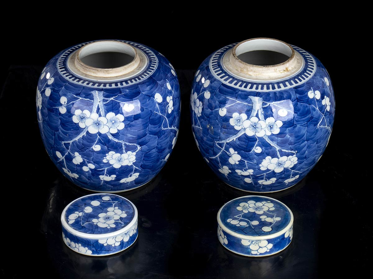 Di forma globulare, hanno coperchio a sezione circolare con lato superiore piatto (uno dei due restaurato), la superficie esterna decorata con fiori di pruno a riserva su fondo a 'ghiaccio spezzato', marchio apocrifo di Kangxi al centro della base di entrambe.
