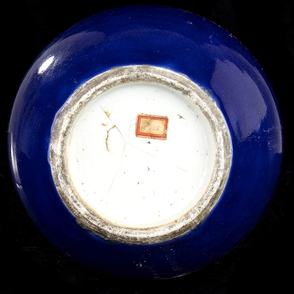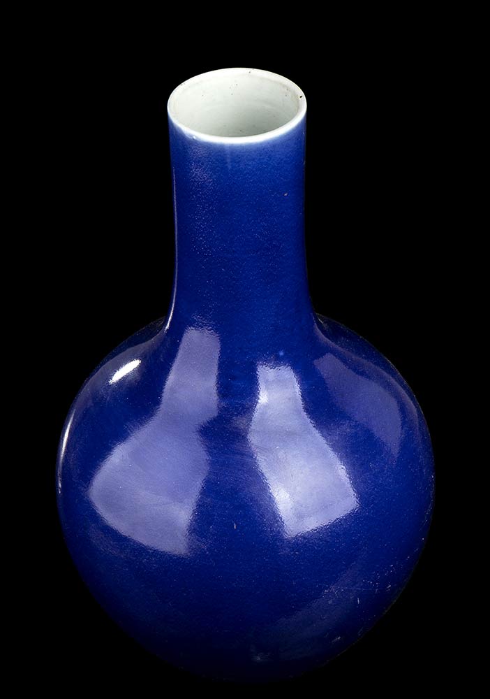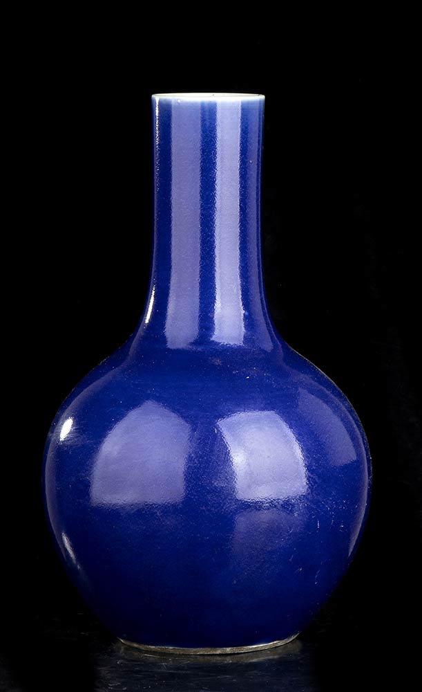VASO A BOTTIGLIA IN PORCELLANA CON INVETRIATURA BLU Cina, dinastia Qing