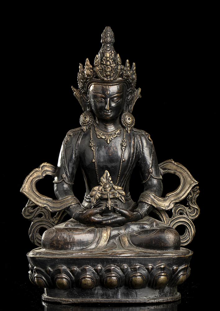 Seduto su base a fiore di loto con le gambe incrociate nella posizione padmasana, i palmi delle mani sovrapposti a tenere l'urna, adornata di gioielli tra cui tiara a cinque pinnacoli, intorno alle braccia gli svolazzi di una sciarpa.