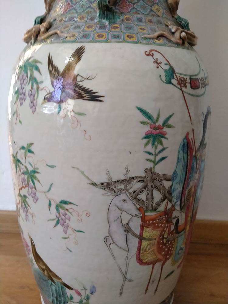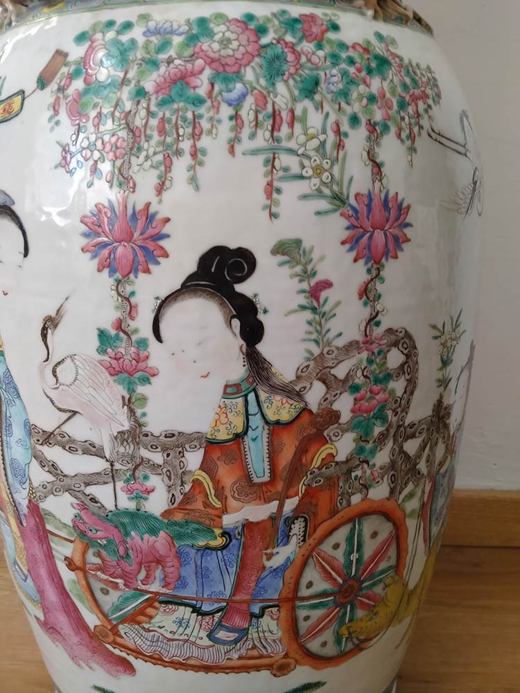 A sezione circolare, il vaso presenta sull'esterno una finissima decorazione a smalti policromi, sul corpo una scena continua con fiori di diverse specie, uccelli e Xiwangmu – la Regina Madre d'Occidente – seduta su un cocchio e affiancata da due assistenti, una con cervo e l'altra con elefante, verso la base e tra collo e spalla si svolge un fitto tappeto di fiori stilizzati sul quale si stagliano due riserve polilobate con oggetti beneaugurali, due draghi a rilievo sulla spalla, le anse a forma di due coppie di quadrupedi che si affrontano, sulla base antica iscrizione di collezione.