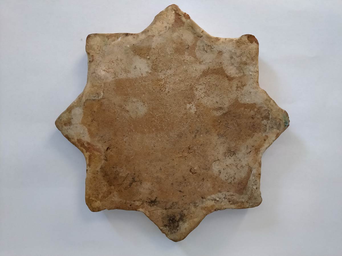 A forma di stella a otto punte, mostra sulla superficie a vista un decoro di una dama a cavallo tra tralci fogliati, uccelli e una lepre.