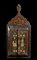 L'edicola in legno decorata in policromia con motivi geometrici e sulle ante all'esterno due figure e all'interno fiori e uccelli, la miniatura all'interno con una figura che offre una bevanda a un altro uomo, la scena racchiusa in alto e in basso da iscrizioni.