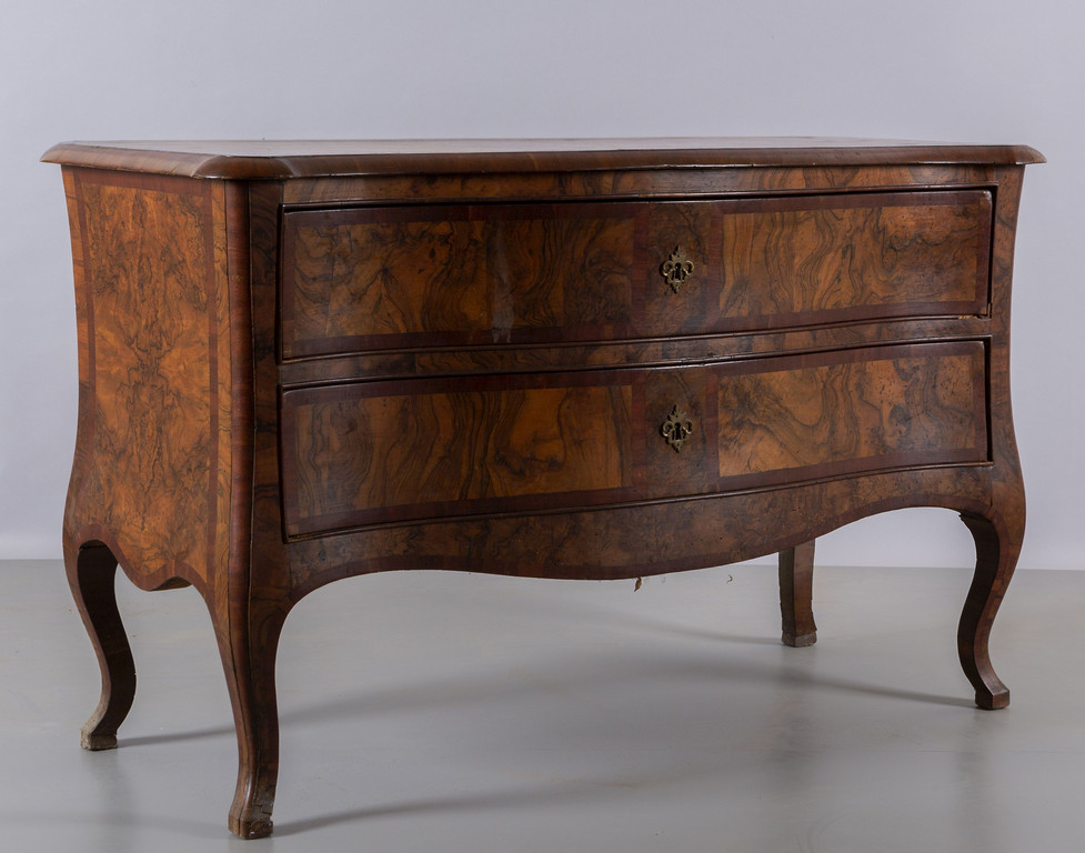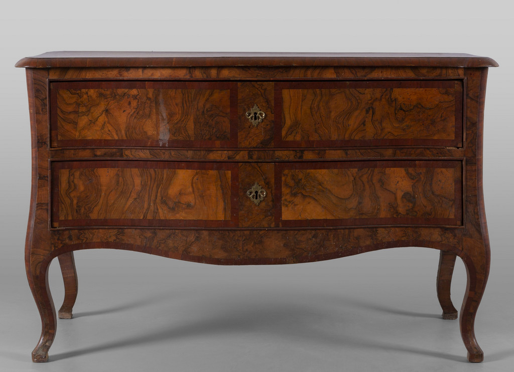 Comò a balestra a due cassetti mosso sul fronte e sui fianchi lastronato in radica Toscana I metà sec.XVIII