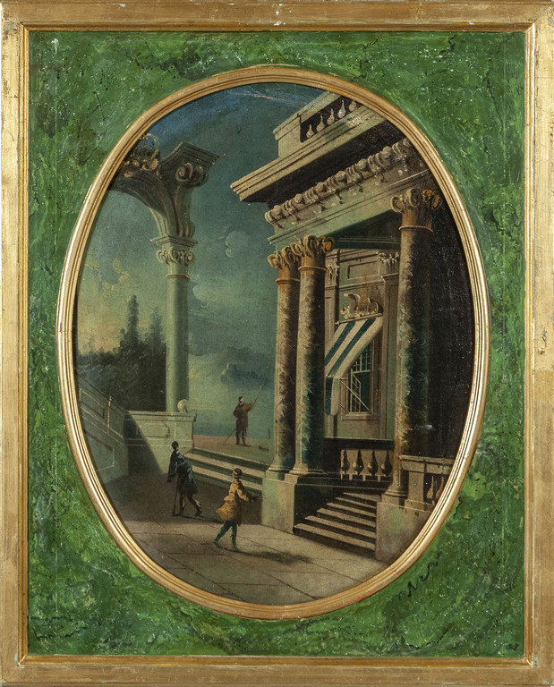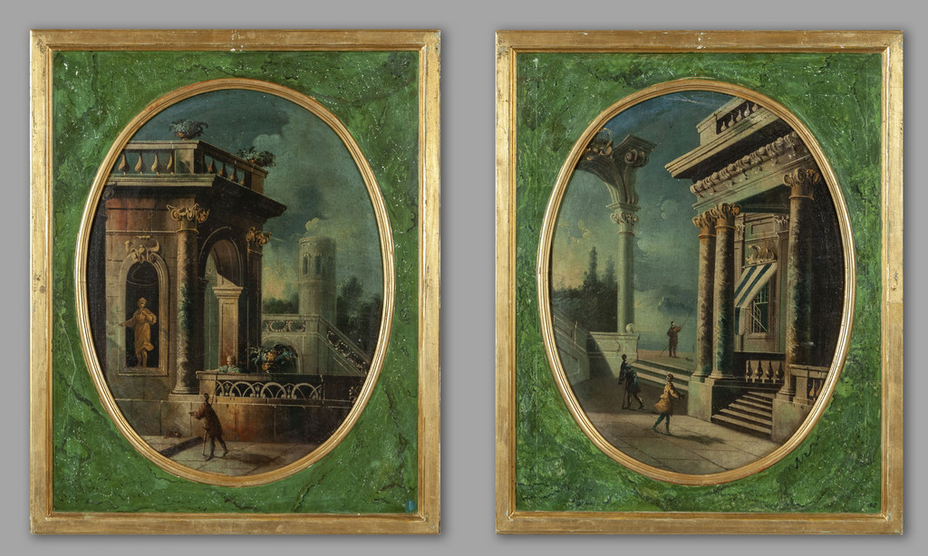 Scuola veneta sec.XVIII 'Capricci architettonici con figure' coppia di olii di forma ovale