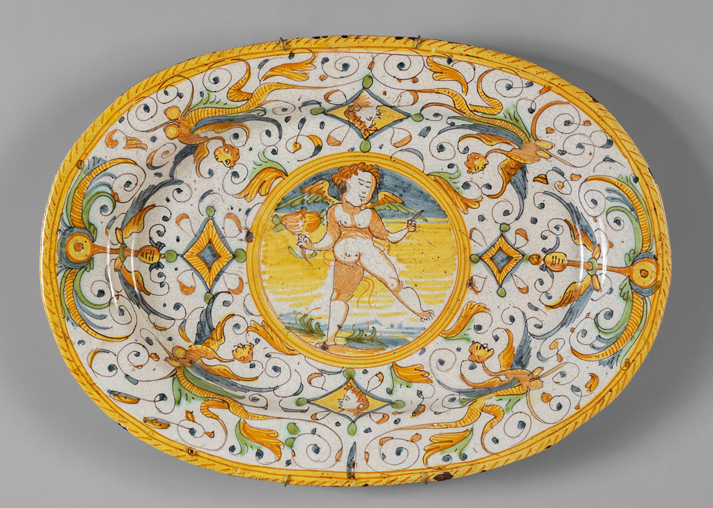 Piatto ovale in maiolica decorata a gran fuoco con figura di Cupido centrale Deruta sec.XVII