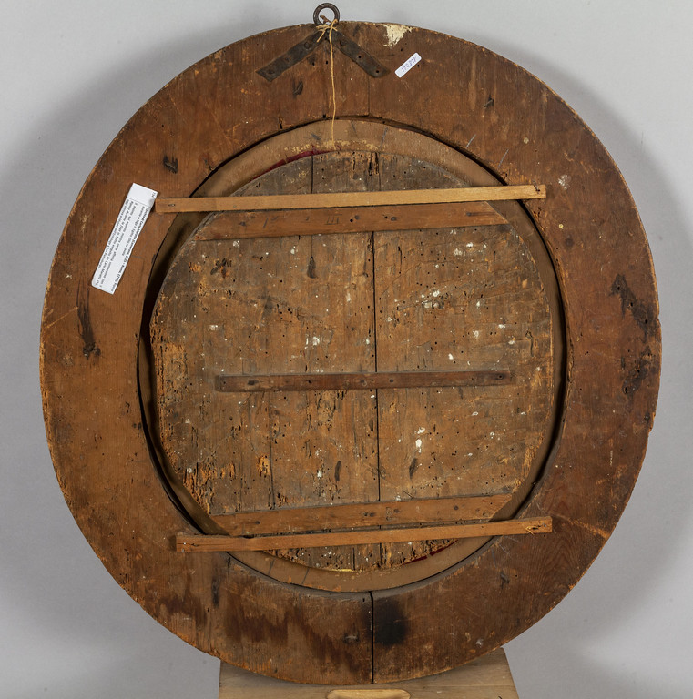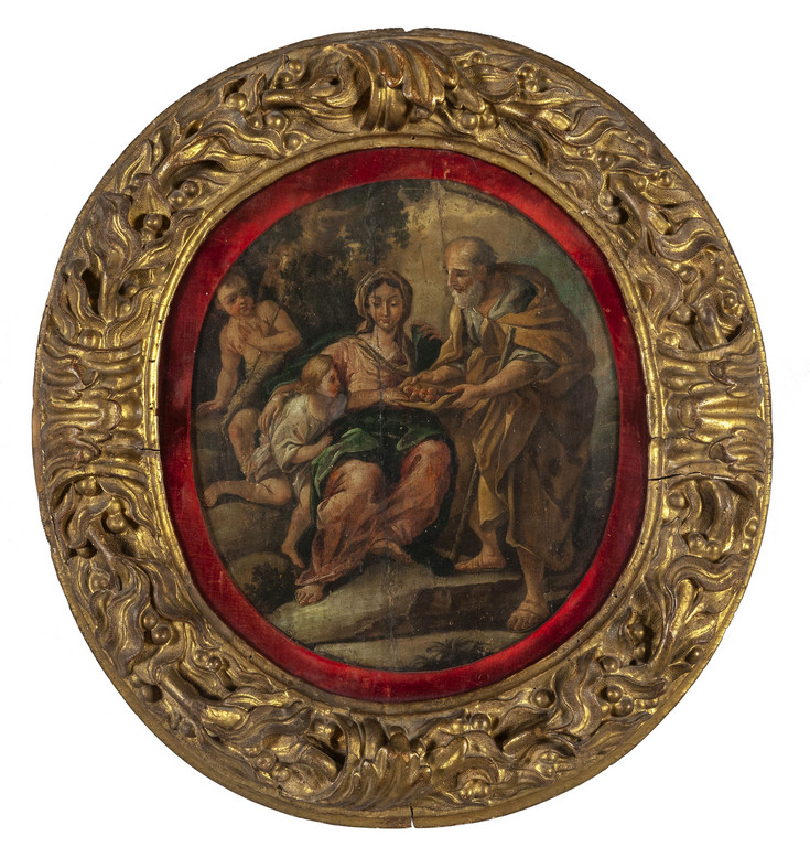 Scuola napoletana sec.XVII 'Sacra Famiglia' olio su tavola di forma ovale cornice coeva in legno intagliato e dorato