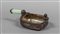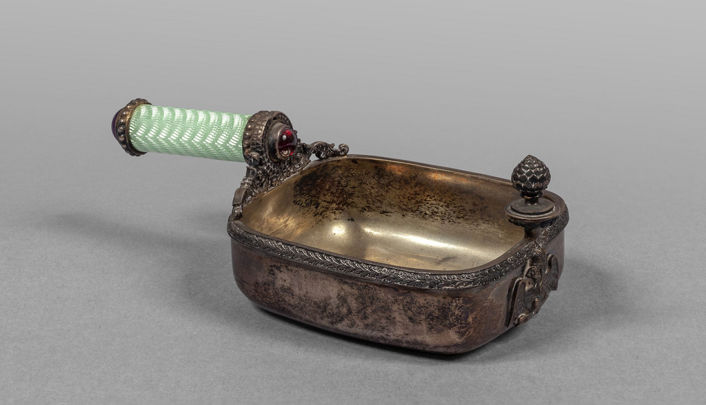 Piccolo Kovsh in argento dorato all'interno manico in smalto verde limone ai lati ametiste e granato cabochon sul fronte un'aquila sovrastata da una pigna a tutto tondo reca la firma Fabergè con aquila imperiale e punzone di oggetto di piccole dimensioni autore Julius Rappoport (iniziali in cirillico)