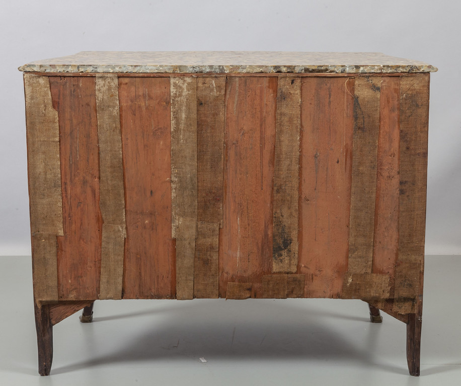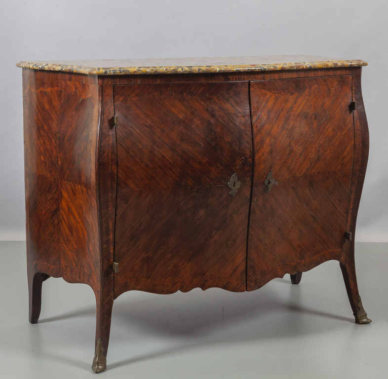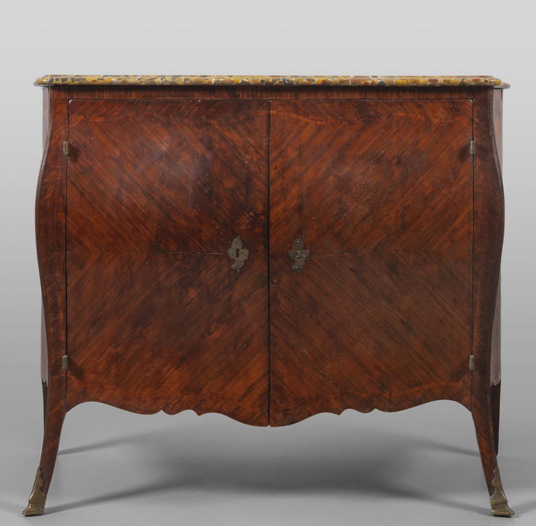Credenza Luigi XV a due sportelli lastronata in palissandro e filettata in legno di rosa piano in breccia Genova sec.XVIII