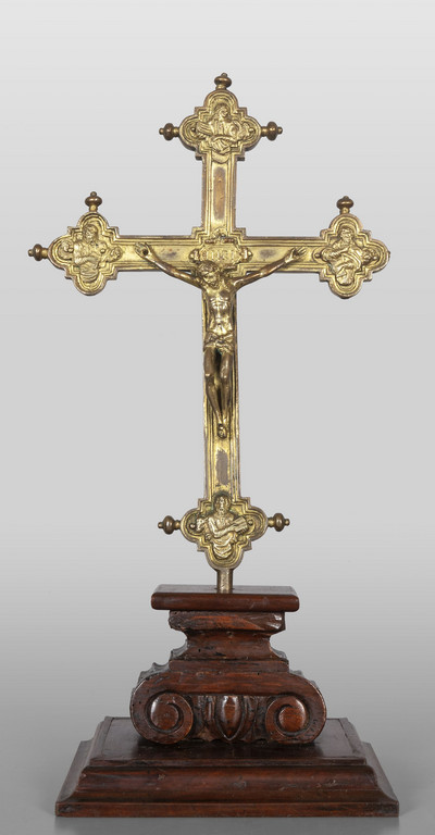 Crocefisso in bronzo dorato su base in legno nei quattro canti profili di Evangelisti sec.XVIII