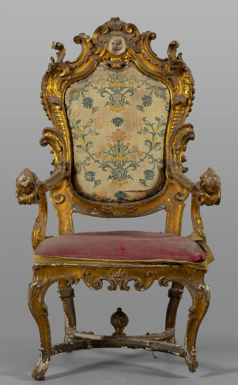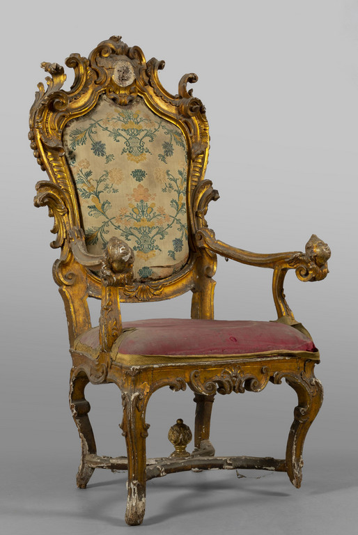 Trono Luigi XIV in legno intagliato e dorato braccioli terminanti con testine di angeli copertura della seduta di colore rosso sec.XVIII