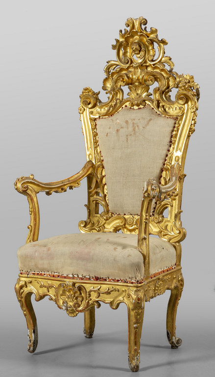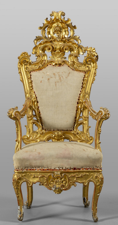 Trono Luigi XIV in legno intagliato e dorato nella parte alta dello schienale una testina di angelo sec.XVIII (difetti e mancanze)