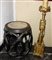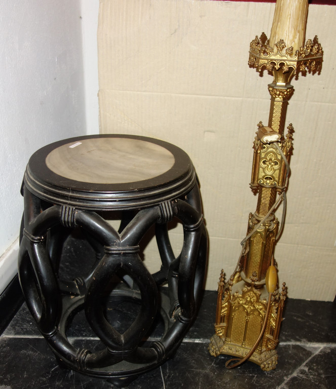 Sgabello cinese in legno laccato a finto bambù e lampada neogotica in legno dorato